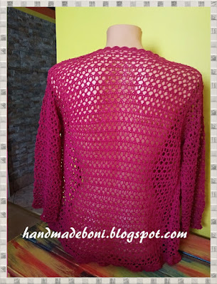 Zrobiłam ją z kordonka Traditions 10 DMC w kolorze fuksji na szydełku numer 1,25 mm wg własnego pomysłu i szydełkowego wzoru. Rozmiar plus minus 40. Sięga do bioder i wysokość żakietu od ramion to 60 cm. Rękawy 3/4 , tak lubię. Dekolt okrągły. Bez zapięcia ale zawsze może być. Miała być moja ale jest córki :-)