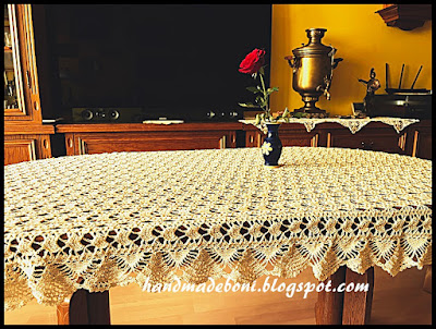 Obrus zrobiłam na szydełku 1,75 mm z poliestrowych nici Koral 10 w kolorze ecru. Korzystałam ze schematu serwetki , zamieszczonego w gazetce "Moje Robótki" nr 3/2018, już drugi raz. W listopadzie 2019 r. zrobiłam mały obrus 100/90 cm ze złotego Korala 10.